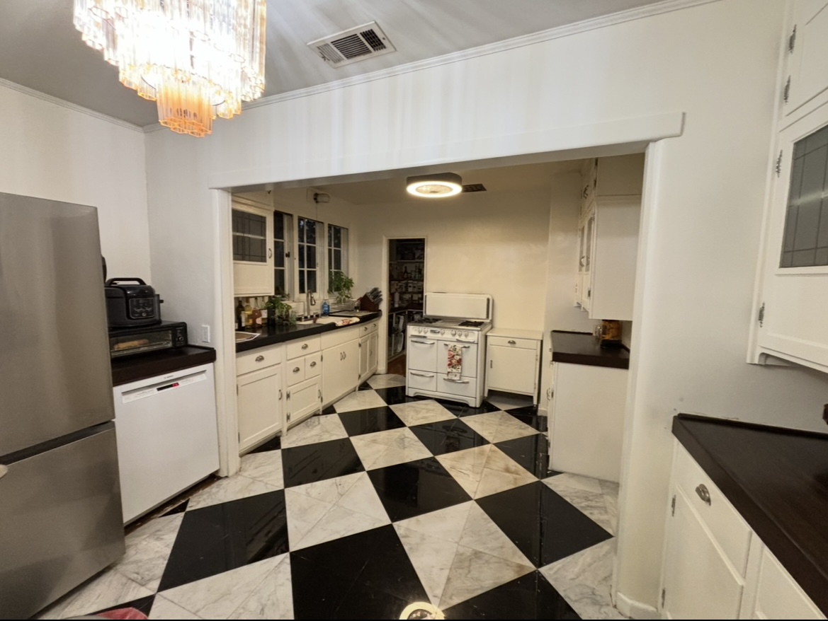 Our kitchen was designed in 1927, and it honestly shows in the character that shines through in the room. At the bottom of the page, you can see the way the kitchen looked when we moved in. I am obsessed with Art Deco and traditional glamour styles and decor. When we first saw the kitchen, it seemed off to me because the floor was hardwood. Now I’m not one to complain about having hardwood floors; in fact, our entire house, besides the bathrooms, is hardwood, and it’s beautiful thanks to the previous owner who had them refurbished. However, hardwood in a kitchen like this didn’t make the most sense to me, and some of the wood was stained. So we decided to go crazy and try to tile the floors ourselves.